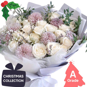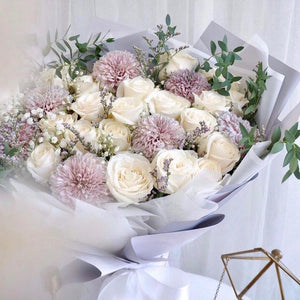 Isi Buket : 8 Bunga Peony, 10 Bunga Mawar, Baby Breath dan Daun Eucalyptus.