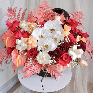 • Kombinasi mewah dari Bunga Mawar, Baby Breath, Bunga Anthurium, Daun Fern dan Bunga Anggrek.