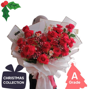 Kombinasi mewah dari Bunga Mawar Merah, Bunga Baby Breath dan Daun Filler.