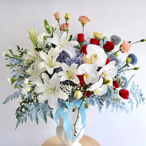 Isi Vase : Bunga Lily, Bunga Mawar, Bunga Peony, Bunga Anggrek, Bunga Hydrangea, Daun Fern dan Baby Breath.