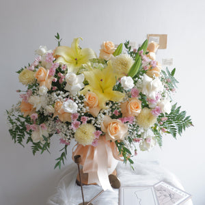 Kombinasi mewah dari Bunga Mawar, Bunga Baby Breath, Bunga Mini Krisan, Bunga Lily, Bunga Peony, Bunga Hydrangea Daun Fern dan Daun Filler.