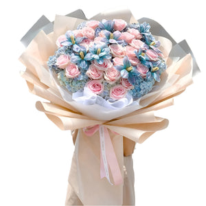 Isi Buket : Bunga Mawar, Bunga Hydrangea dan Bunga Freesia.