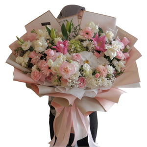 Isi Buket : Bunga Mawar, Bunga Peony, Bunga Hydrangea, Bunga Lily, Bunga Krisan, Bunga Gerbera, Bunga Baby Breath dan Daun Eucalyptus.