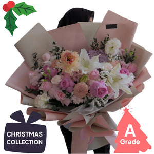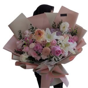 Kombinasi mewah dari Bunga Mawar, Bunga Krisan, Bunga Hydrangea, Bunga Peony, Bunga Baby Breath dan Daun Eucalyptus.