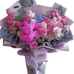 Isi Buket : Bunga Mawar, Bunga Peony, Bunga Anggrek, Bunga Hydrangea Bunga Baby Breath, Bunga Krisan dan Daun Fern.