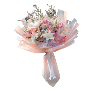 Isi Buket : Bunga Mawar, Bunga Lily, Bunga Baby Breath dan Bunga Caspia.