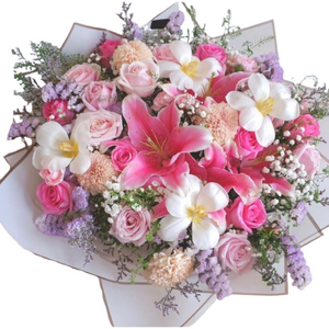 Isi Buket : Bunga Mawar, Bunga Lily, Bunga Krisan, Bunga Peony, Bunga Anggrek, Bunga Lavender, Bunga Baby Breath, Bunga Caspia.