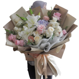 Isi Buket : Bunga Mawar, Bunga Hydrangea, Bunga Lily, Bunga Peony, Bunga Baby Breath dan Daun Eucalyptus.