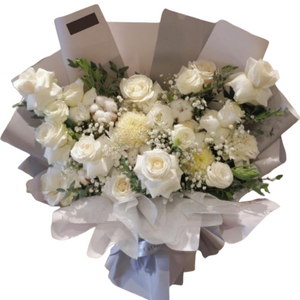 Isi Buket : Bunga Mawar Putih, Bunga Peony, Bunga Baby Breath dan Daun Eucalyptus.