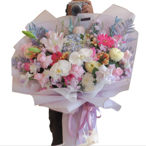 Isi Buket : Bunga Mawar, Bunga Lily, Bunga Snapdragon, Bunga Anggrek, Bunga Krisan, Bunga Peony, Bunga Gerbera, Bunga Mini Krisan dan Daun Fern.