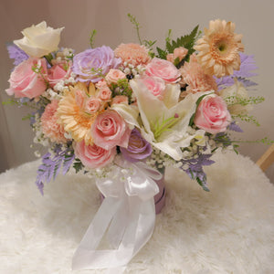 Perpaduan indah Bunga Mawar, Bunga Lily, Bunga Gerbera, Bunga Carnation, Bunga Baby Breath dan Daun Fern.