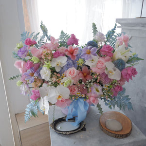 Perpaduan indah Bunga Mawar, Bunga Pompom, Bunga Lily, Bunga Anggrek, Bunga Tweedy's Lewisia, Bunga Baby Breath, Daun Fern dan Daun Filler.