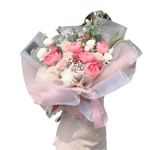 Isi Buket : Bunga Mawar, Bunga Peony, Bunga Krisan, Bunga Baby Breath, Bunga Caspia dan Daun Filler.