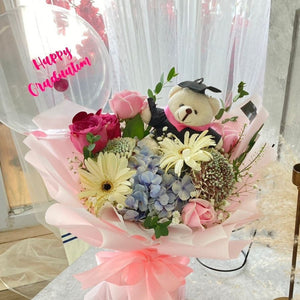 Isi Buket : Teddy Small Size, Bunga Mawar, Bunga Gerbera, Bunga Krisan, Bunga Hydrangea, Bunga Baby Breath dan Daun Eucalyptus.