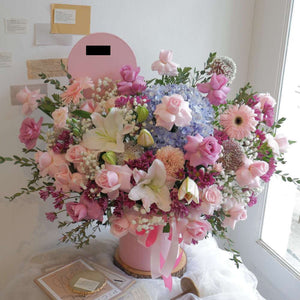 Perpaduan indah Bunga Mawar, Bunga Hydrangea, Bunga Krisan, Bunga Lily, Bunga Baby Breath dan Daun Filler.