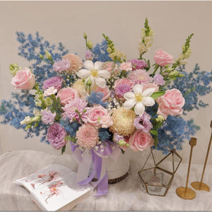 Isi Box : Bunga Mawar, Bunga Krisan, Bunga Melati, Bunga Snapdragon, Bunga Eustoma, Bunga Baby Breath dan Daun Fern.
