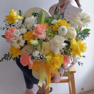Perpaduan indah Bunga Mawar, Bunga Krisan, Bunga Gerbera, Bunga Lily, Bunga Hydrangea, Bunga Baby Breath, dan Daun Filler.