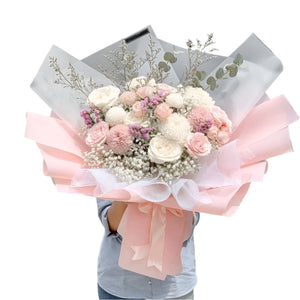 Isi Buket : Bunga Mawar, Bunga Peony, Bunga Baby Breath, Bunga Caspia dan Daun Filler.