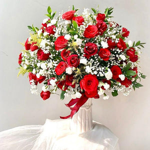• Kombinasi mewah dari Bunga Mawar Merah, Baby Breath, Bunga Caspia dan Daun Filler.