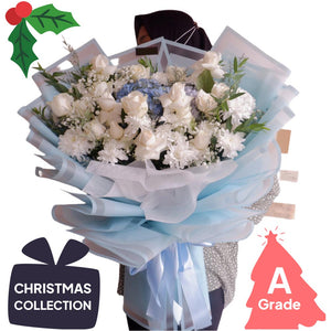 Kombinasi mewah dari Bunga Mawar Putih, Bunga Krisan, Bunga Hydrangea, Bunga Baby Breath dan Daun Eucalyptus.
