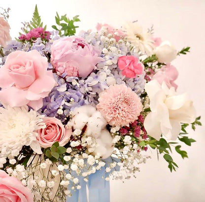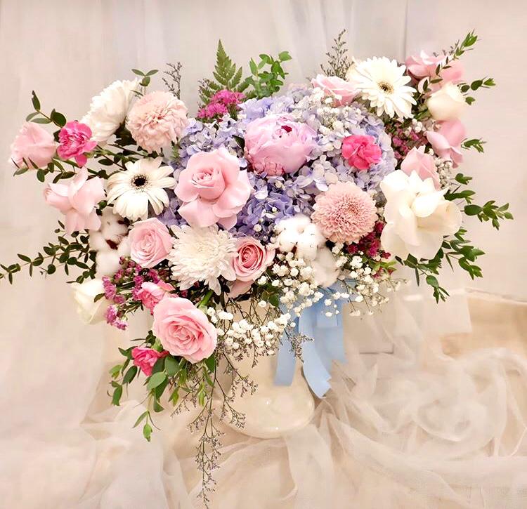 Isi Vase : Bunga Mawar, Baby Breath, Daun Fern, Daun Eucalyptus, Bunga Caspia, Bunga Peony, Bunga Hydrangea dan Bunga Krisan.